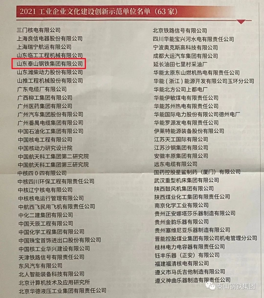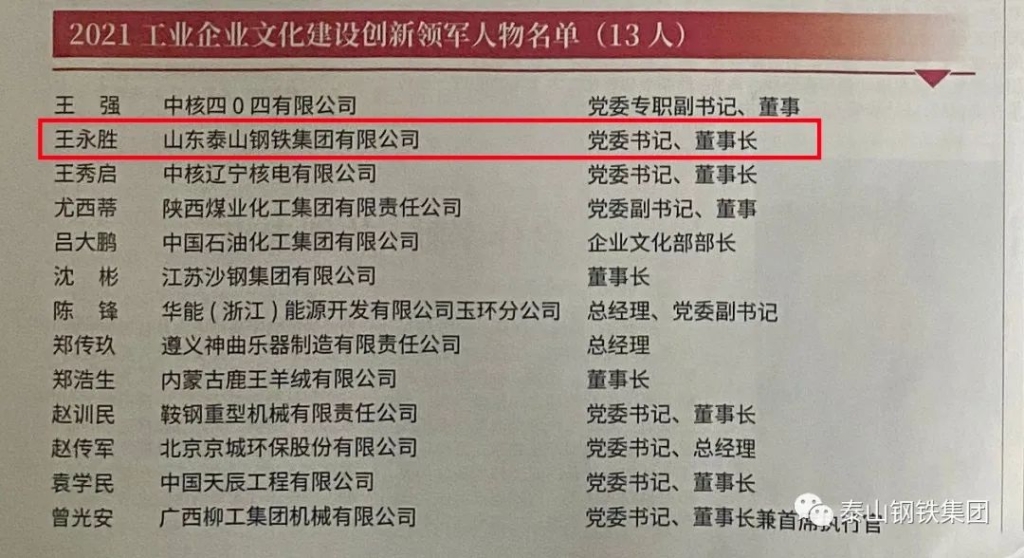 近日,中国工业新闻网及中国工业报刊登了“2021工业企业文化建设创新示范单位及创新人物、成果”名单,泰山钢铁集团荣获“2021年工业企业文化建设创新示范单位”称号,集团党委书记、董事长、总裁王永胜荣获“2021工业企业文化建设创新领军人物”称号。