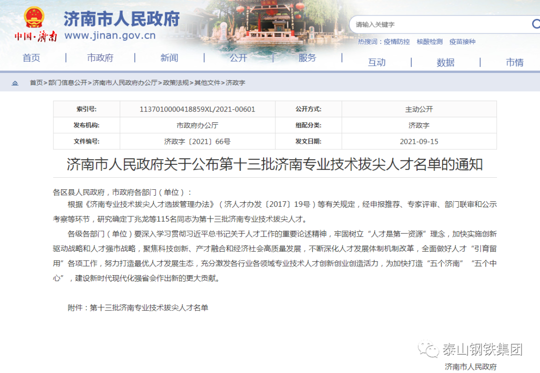 济南市人民政府公布第十三批济南专业技术拔尖人才名单,集团党委书记、董事长、总裁王永胜,职工亓萌光荣上榜。