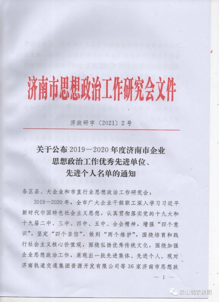济南市思想政治工作研究会办公室下发《关于公布2019--2020年度济南市企业思想政治工作优秀先进单位、先进个人名单的通知》,集团荣获“思想政治工作优秀企业”荣誉称号,集团党委书记、董事长、总裁王永胜荣获“优秀企业思想政治工作者”荣誉,集团思想政治工作研究会荣获“优秀思想政治 工作研究会”荣誉称号,集团思想政治工作研究会还获得了其他荣誉。